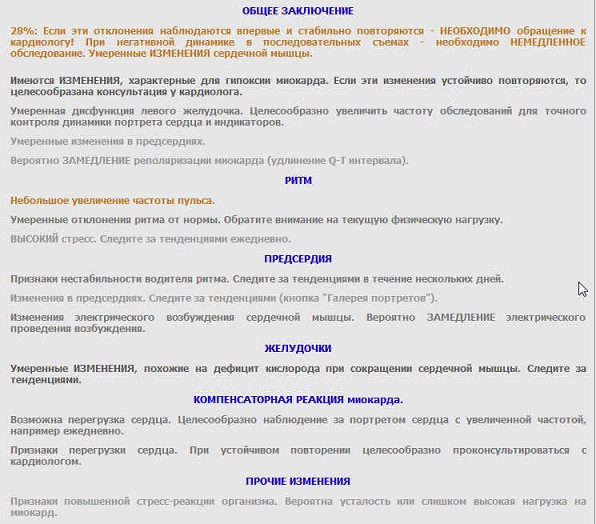Сразу после обследования, система Kardi.Ru автоматичически анализирует данные, полученные при обследовании, и возвращает Вам отчет, который содержит: