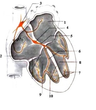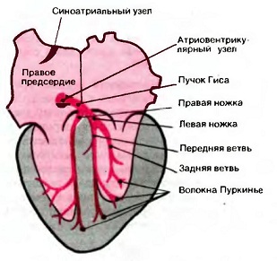 Ритмические импульсы могут генерироваться только специальными клетками пейсмекера (водителя ритма) и проводящей системы сердца. Таким водителем ритма является синусно-предсердный или синоатриальный (СА) узел, который находится в стенке правого предсердия. Возбуждение от СА узла распространяется по предсердиям, а затем по проводящей системе импульсы передаются на предсердно-желудочковый узел. По пучку Гиса возбуждение передается от атриовентрикулярного узла на желудочки.