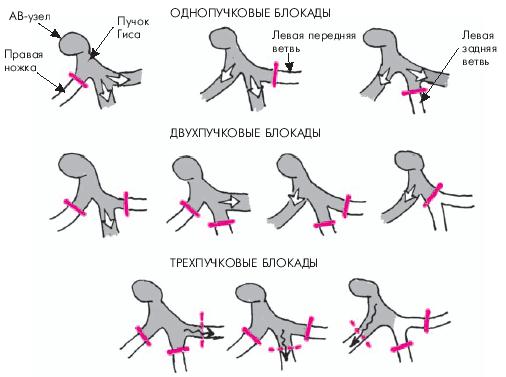 Блокады ножек пучка Гиса характеризуются замедлением или полным прекращением передачи импульса по одной ветви, двум или трём ветвям пучка соответственно. Основываясь на анатомическом строении пучка Гиса, выделяют однопучковые, двухпучковые и трехпучковые блокады.