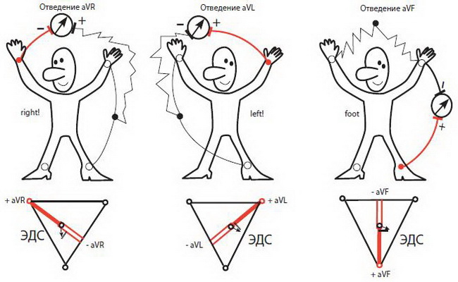 после этого в усиленных отведениях от конечностей (aVR, aVL и aVF)