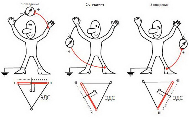Запись показаний проводят при спокойном дыхании, на высоте вдоха (в III отведении). Первично записывают ЭКГ в стандартных отведениях (I, II, III),